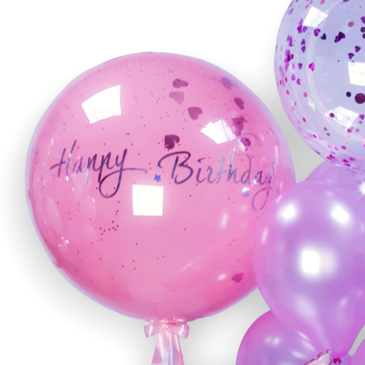 Розовый гигант с надписью и фонтан из 3-х шаров Баблс, розовых шариков перламутр и чудесной розовой кошечки украсит праздник любой девочки!
